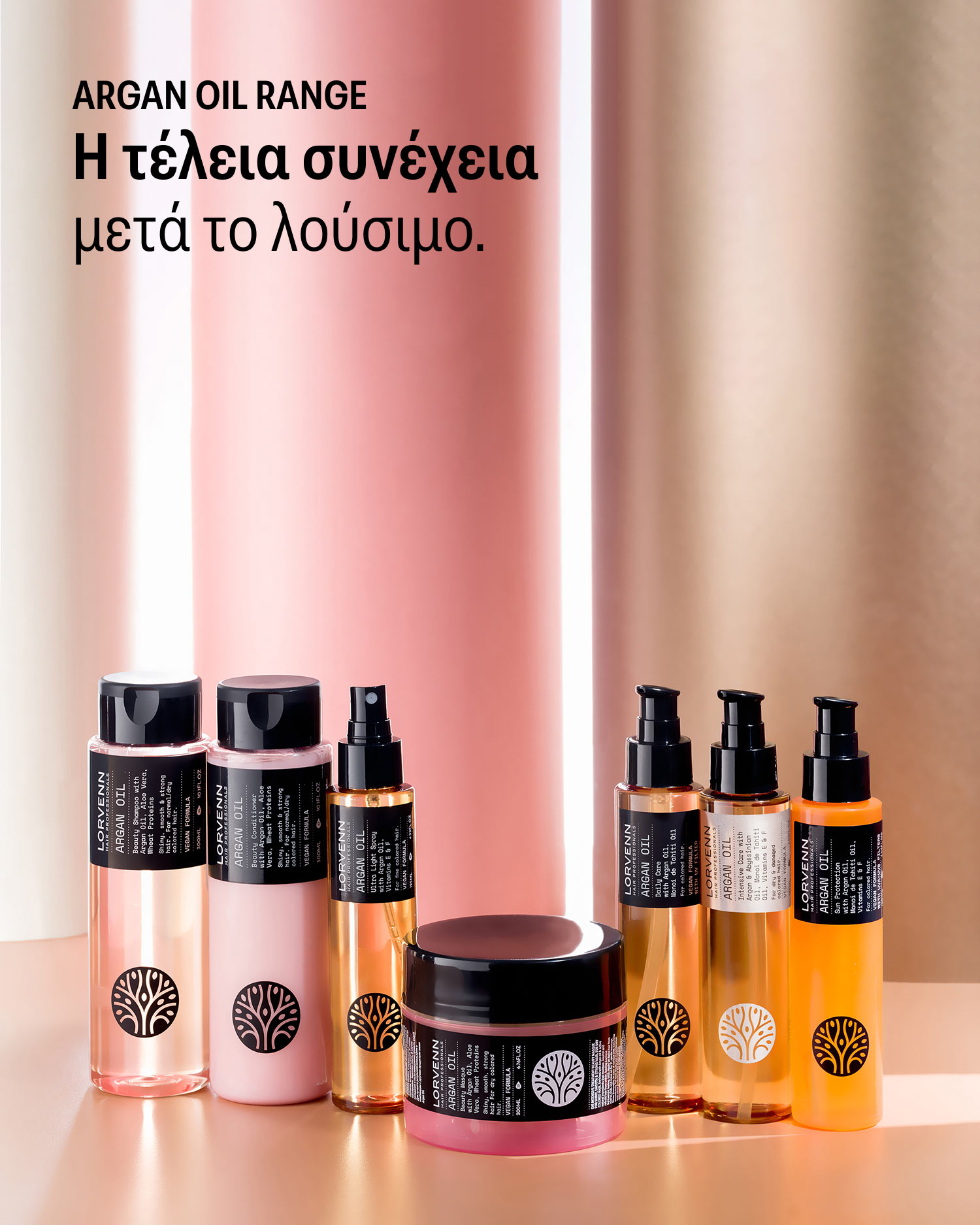 Η σειρά Argan Oil της Lorvenn συνδυάζει πολύτιμα εξωτικά έλαια — Argan, Monoi de Tahiti και Abyssinian — με πρωτεΐνες σιταριού για βαθιά θρέψη, ενυδάτωση και εκτυφλωτική λάμψη. Vegan σύνθεση, επαγγελματικό αποτέλεσμα.