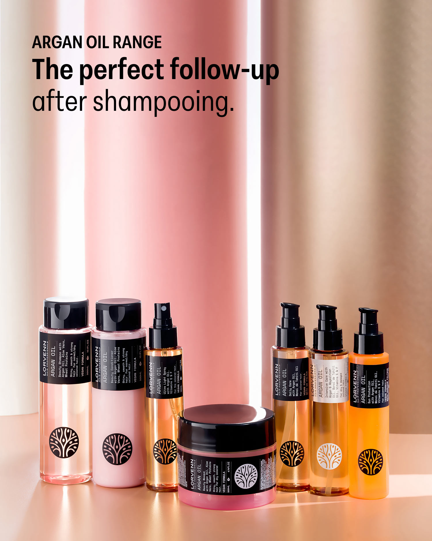 The Argan Oil range by Lorvenn combines precious exotic oils — Argan, Monoi de Tahiti and Abyssinian — with wheat proteins for deep nourishment, hydration and dazzling shine. Vegan formula, professional results.