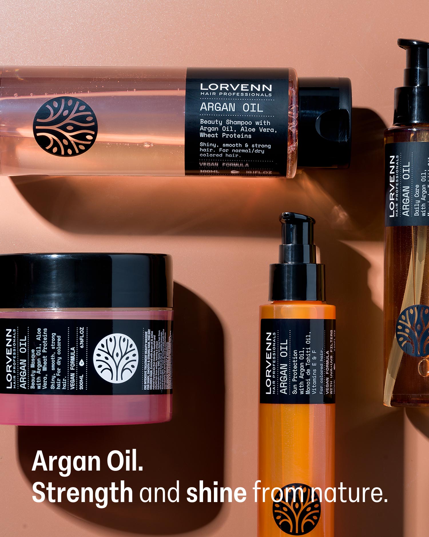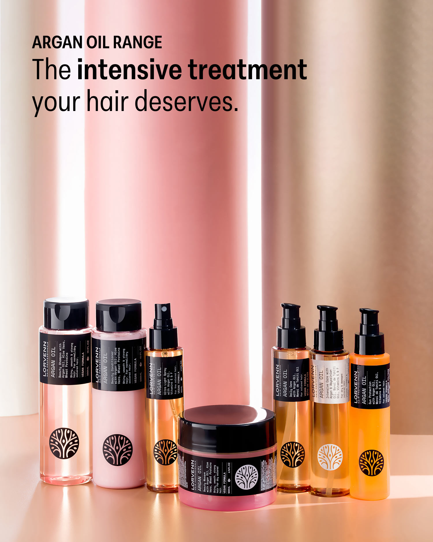 The Argan Oil range by Lorvenn combines precious exotic oils — Argan, Monoi de Tahiti and Abyssinian — with wheat proteins for deep nourishment, hydration and dazzling shine. Vegan formula, professional results.