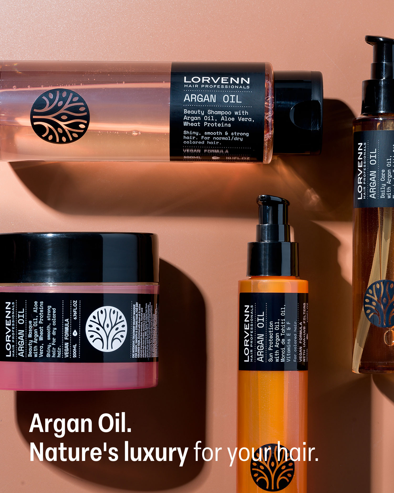 The Argan Oil range by Lorvenn combines precious exotic oils — Argan, Monoi de Tahiti and Abyssinian — with wheat proteins for deep nourishment, hydration and dazzling shine. Vegan formula, professional results.